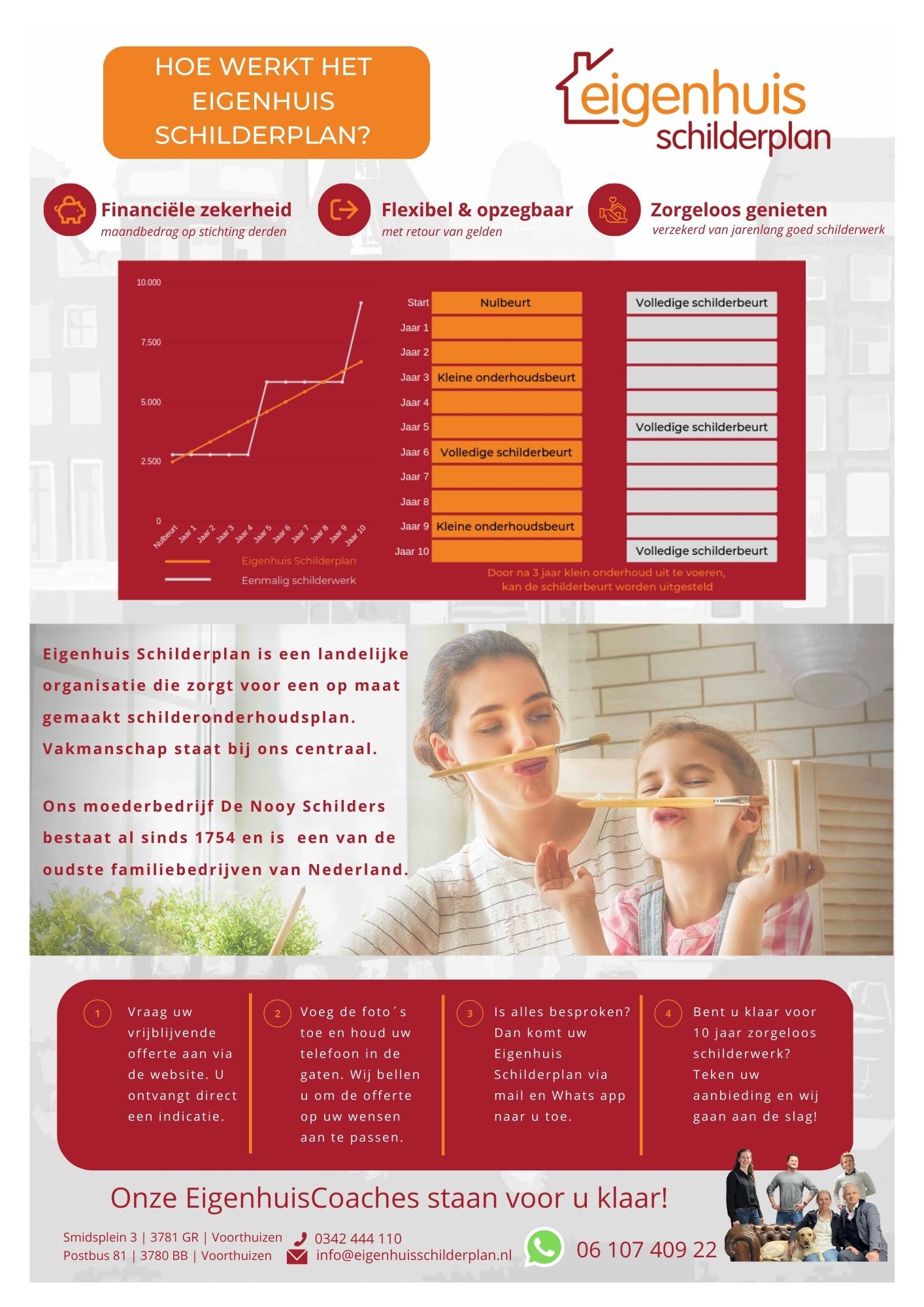 Dan wordt het dit jaar nog voor u uitgevoerd door onze zorgvuldig geselecteerde vakschilders. Zij hebben allemaal het 1754-keurmerk en zijn lid van onze Vereniging van Eigenhuis Schilder. De uitvoering is afhankelijk van de weersomstandigheden gedurende het jaar.